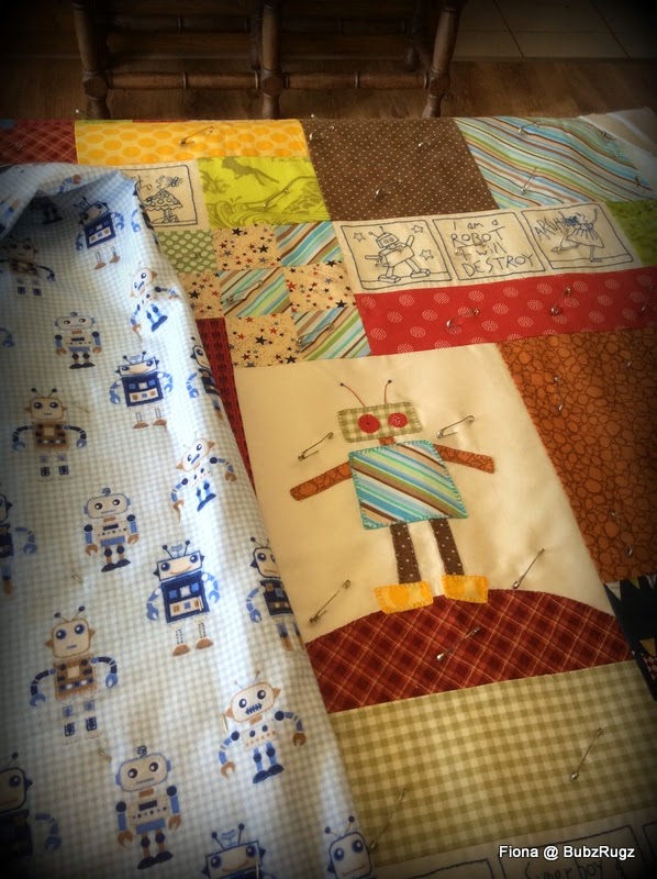 Righto, Gotto Go.... I am going to be playing with a quilt top I finished ages ago... this is Anni Downs "Boys Story" and I have some warm robot flannelette for the backing.....