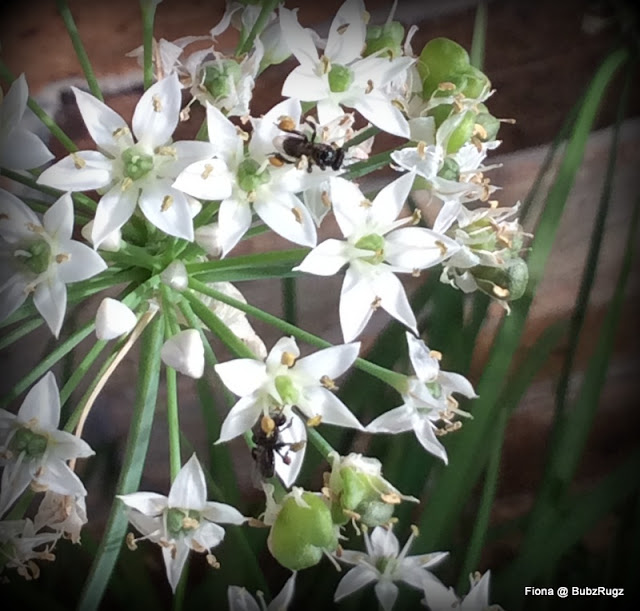Our little Australian native bees are very sweet and little, don't sting and I think it's a compliment that they come into my garden. The garlic chives in my herb planter have gone to flower and the bees have been collecting pollen like mad.... I hope you can see them here - looks like they have big boots on -