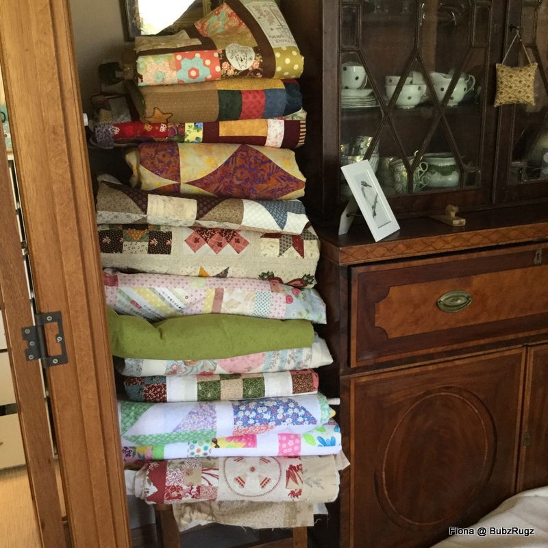 I am a bit embarrassed to admit there are 13 quilt tops there..... but one step closer to getting completed as they all have wadding and backing put aside for them