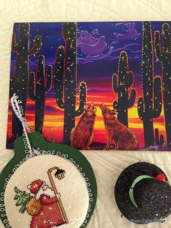 The FHFS swap group I am in is opening it's 12 days of Christmas presents and these are what I have had from Shez.... some Christmas cards, a photo album, hand stitched deer picture (oh it is dear).. and today a set of 3 handmade ornies... they are on the tree already...