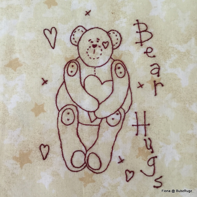 But today I am going to do a bit of my own quilting..... this bear is going to be another cushion. I've done some little rosey flowers around the bear and now some hearts... I think it will be a little bit cute!