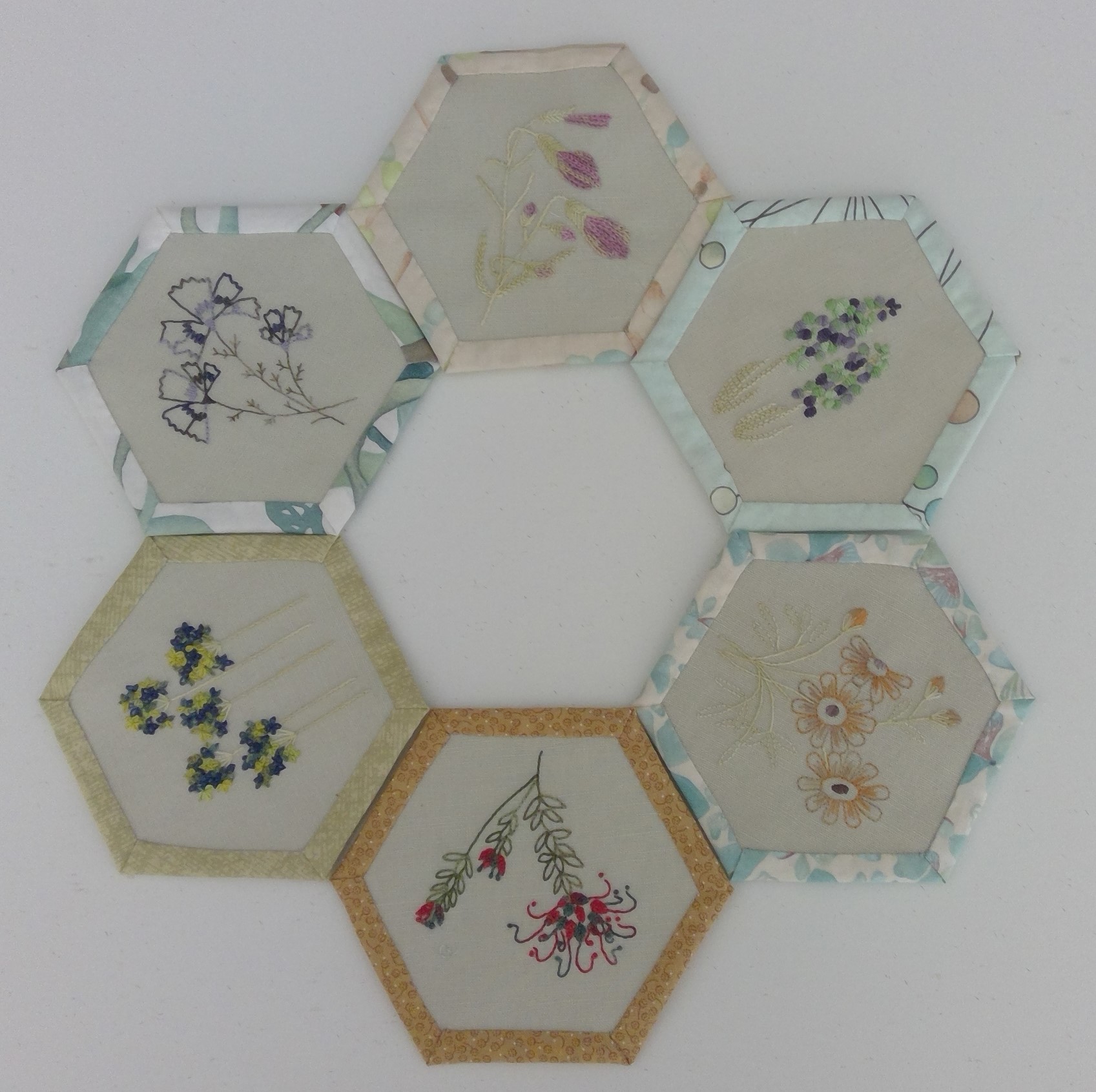 Evening TV watching our Matilda's in the Womens World Cup Soccer has meant extra sewing time so I did another 6 self bound hexagons from my Field Journal stitcheries...
